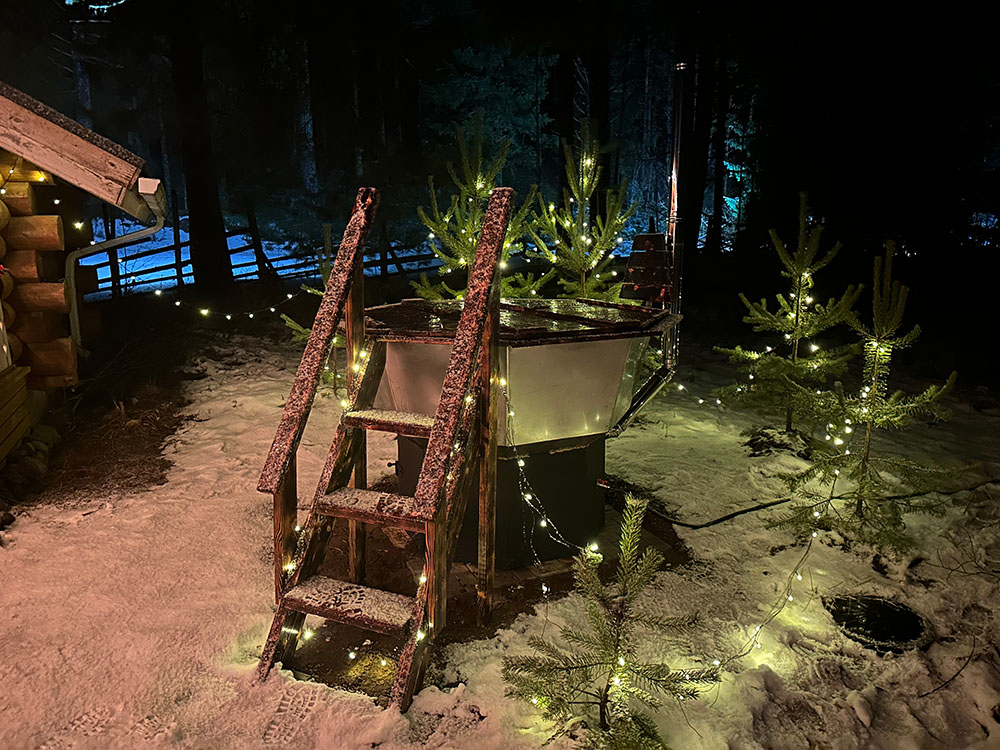 Устроить расслабляющую водную процедуру посреди хвойного леса, украшенного праздничной подсветкой.